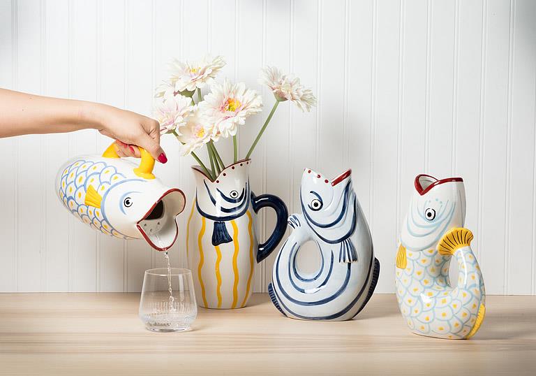 This modern interpretation of a traditional fish jug is rendered in a crisp blue and white palette. It balances form and function for entertaining or everyday use.