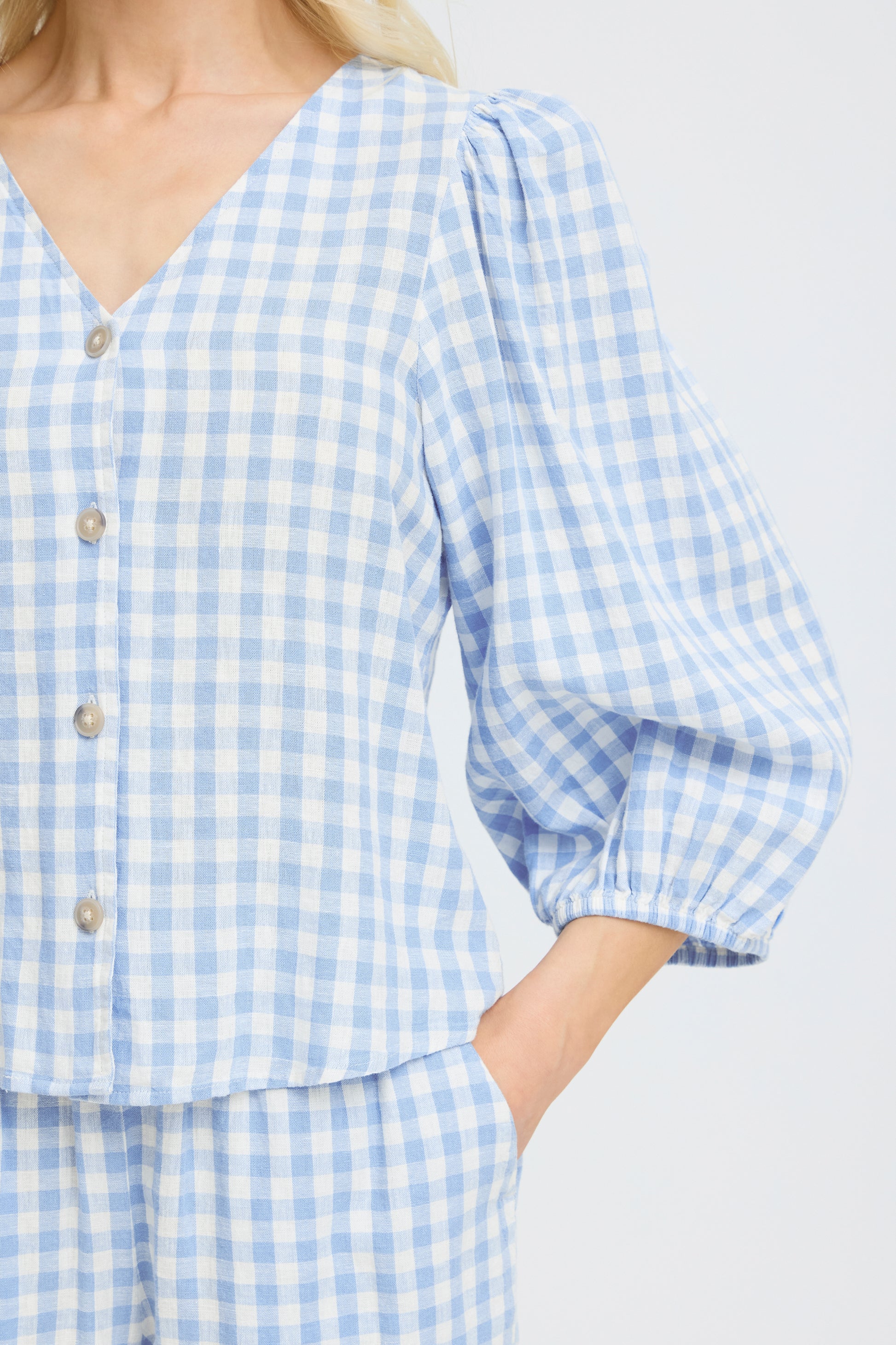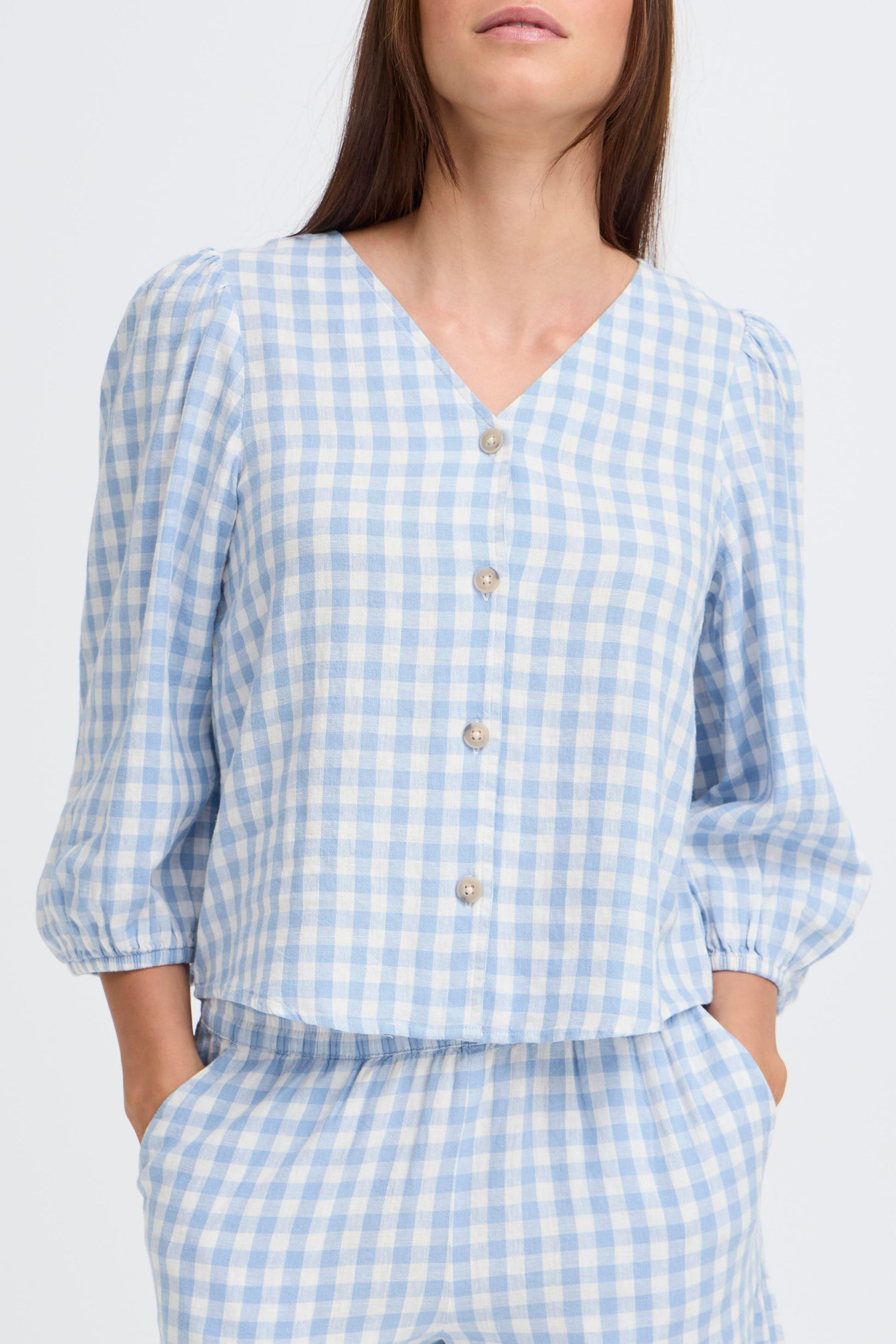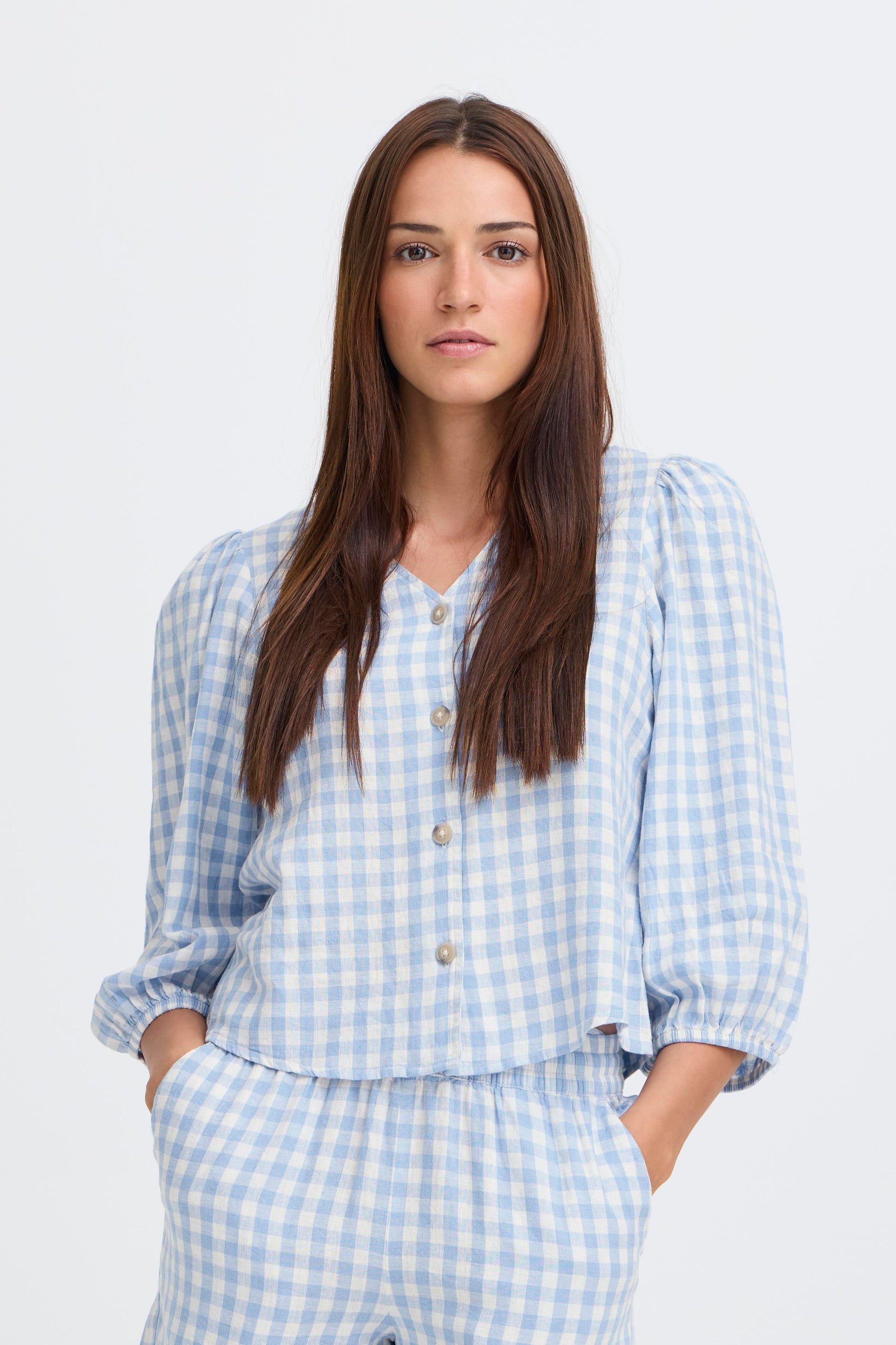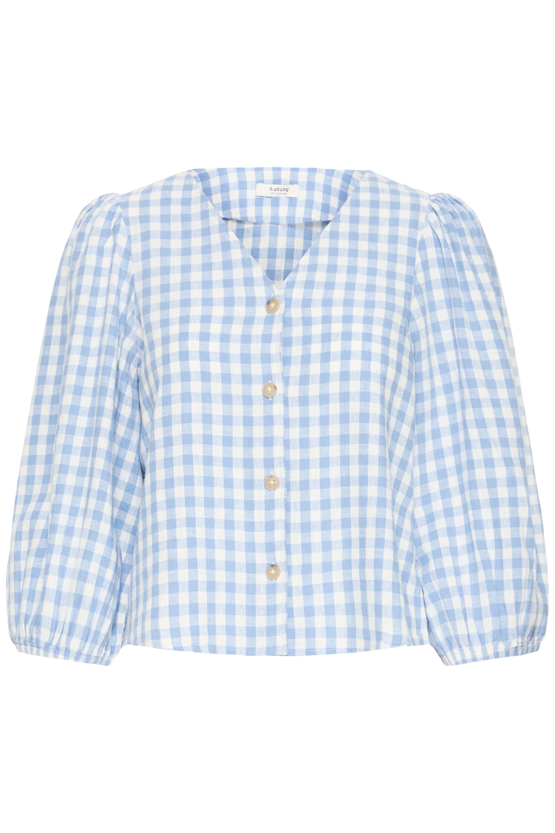 Falakka Puff Shirt by b.young in a fresh blue gingham pattern. This relaxed-fit shirt features voluminous puffed sleeves and a timeless checked design, perfect for layering or wearing solo. The structured cotton blend offers comfort and durability, while the classic gingham print adds effortless style to everyday outfits.