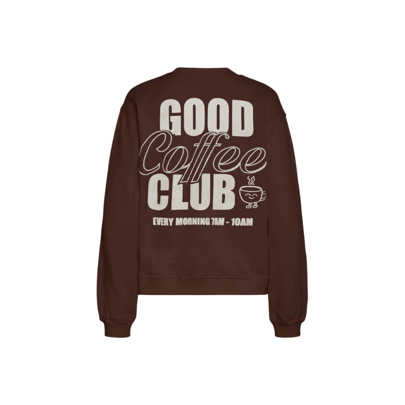 Brew up cozy vibes with this rich brown crewneck. The front keeps it minimal with a small “Good Coffee Club” print, while the back makes a bold statement with oversized lettering, a steaming coffee cup graphic, and the invite “Every Morning 7AM – 10AM.”