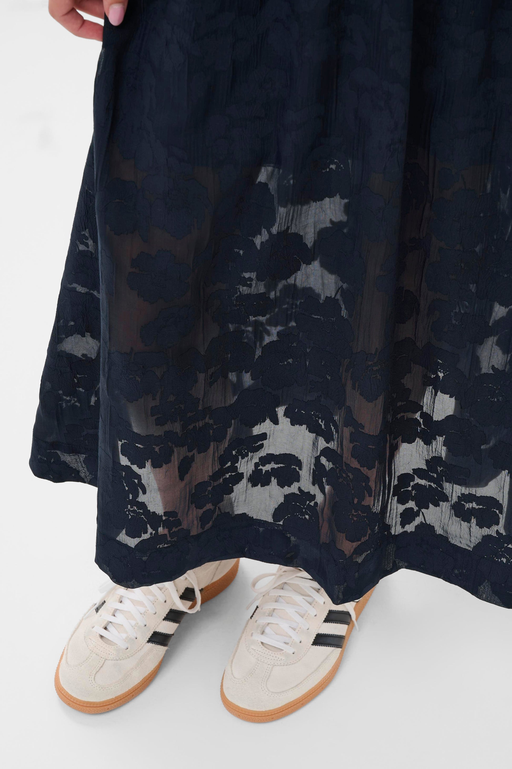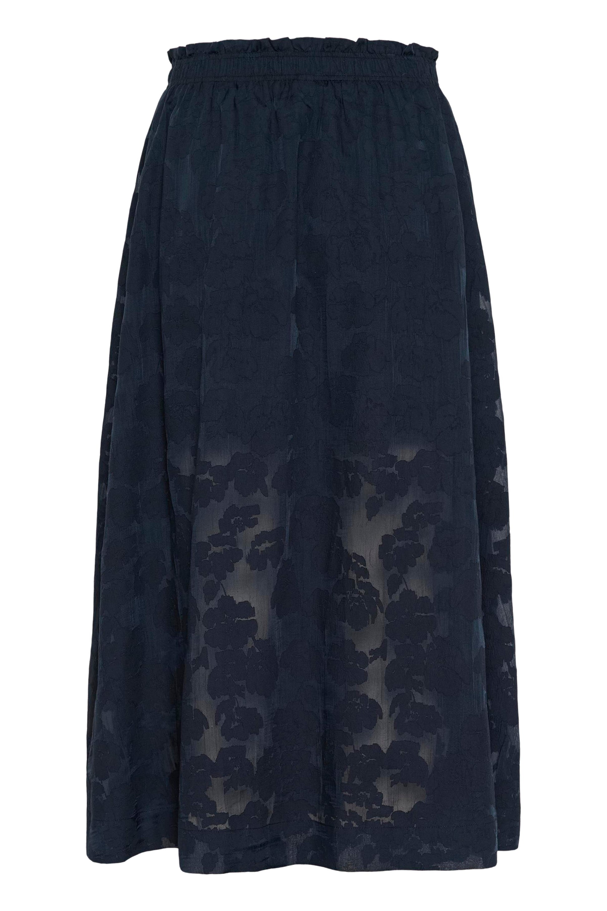 A flowy navy midi skirt with a soft elastic waistband for an easy, comfortable fit. The lightweight fabric features a subtle tonal floral texture that adds depth and movement, making it a beautiful piece to dress up or style casually.